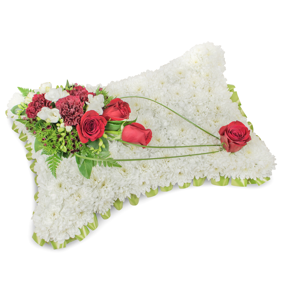 Express your deepest condolences with our stunning sympathy bouquet, thoughtfully arranged with freshly hand-selected white chrysanthemums, red roses, white freesias, dark red carnations, dianthus, and bear grass.